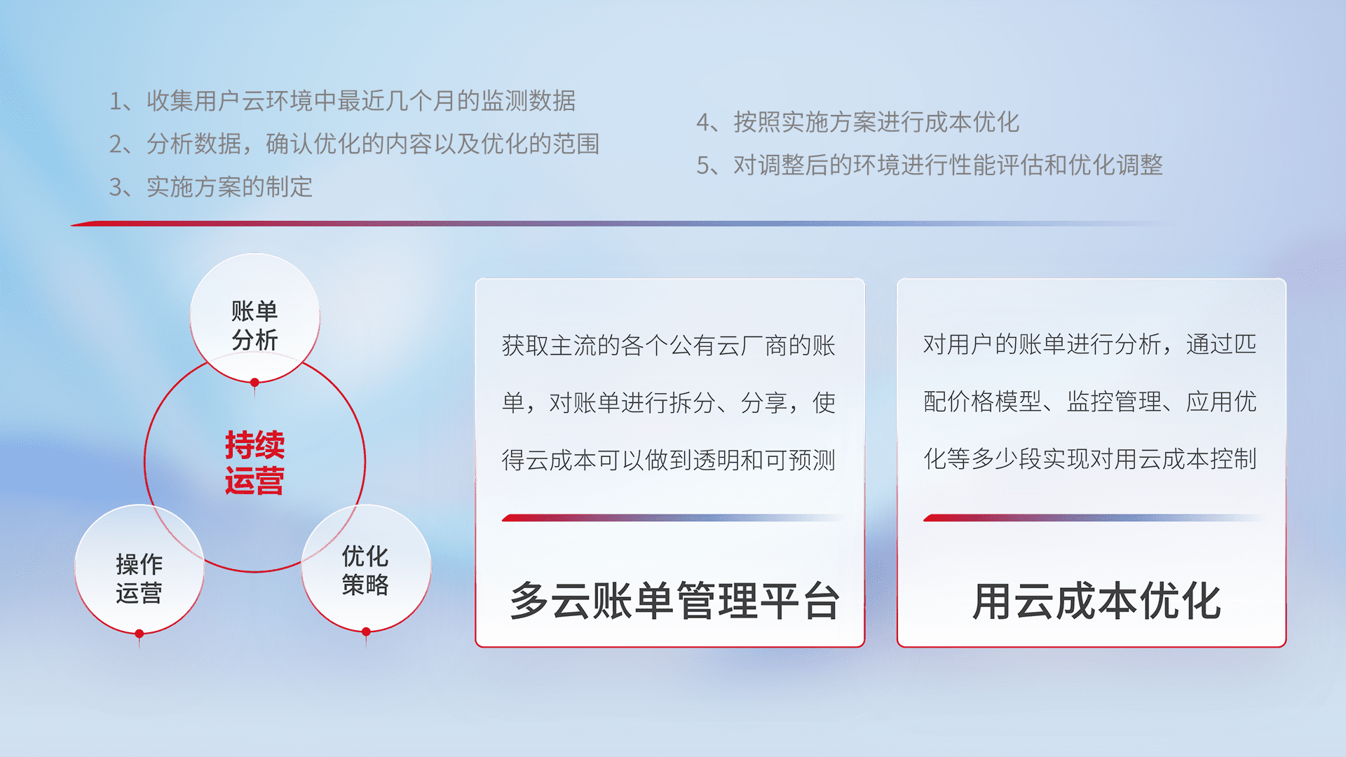 通过多云纳管,,,以统一的资源数据模型把客户的云资源进行抽象和封装,,,,进而实现对多云资源的统一操作,,保障云资源管理的可靠性、、稳定性与可用性。。量身定制化运维内容,,配置、、、开发运维、、、补丁管理、、、备份、、监控、、、认证和访问管理、、、审计和日常巡检等,,,,保障在用云过程中的可靠度,,稳定度以及高可用率。。